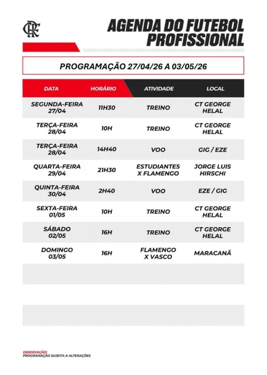 A terça (28) não será diferente, e o Flamengo treina às 10h. Finalmente, às 14h40, a delegação rubro-negra embarca para a Argentina, onde encara o Estudiantes no Estádio Jorge Luis Hirschi, na quarta-feira (29), às 21h30.